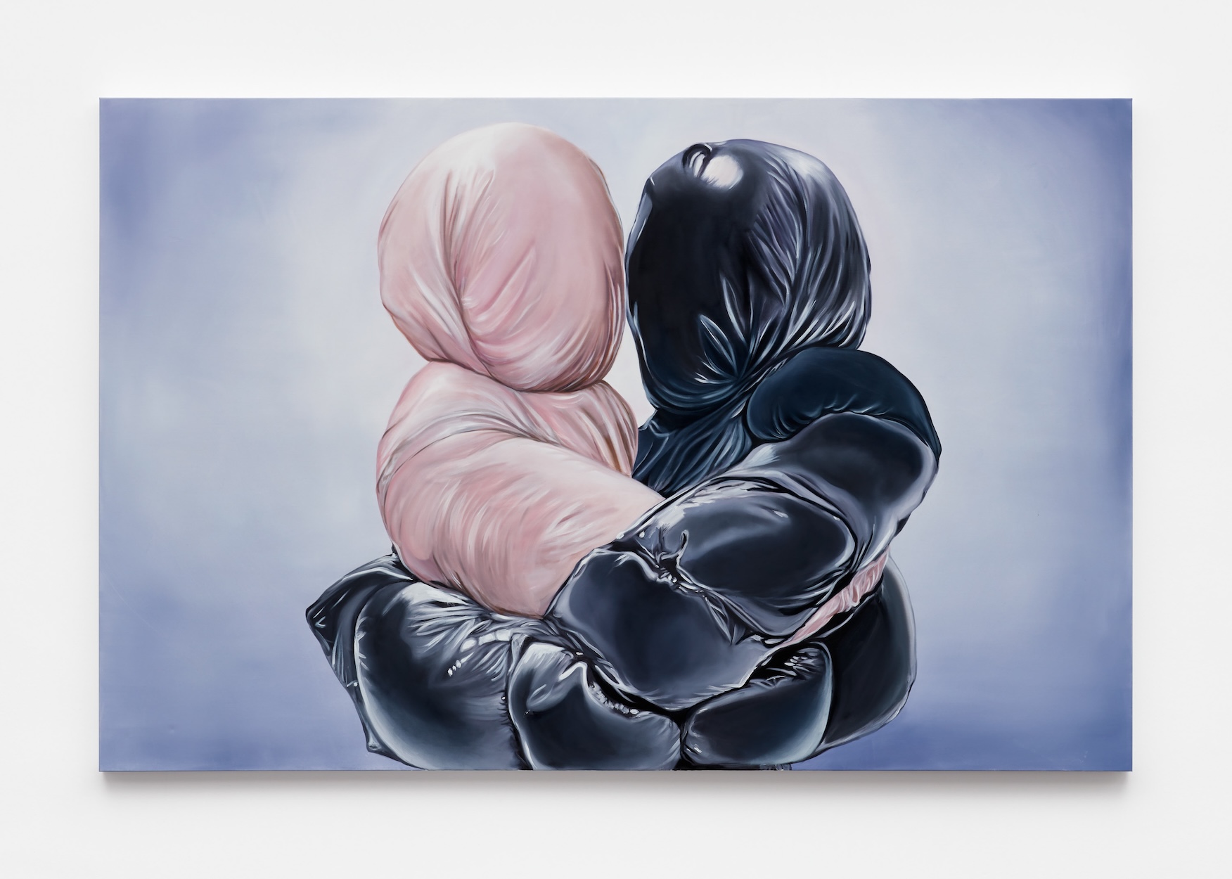Berlin-based artist Charlie Stein explores the shifting boundaries where intimacy meets mediation and human presence becomes entangled with artifice. Her paintings depict padded, latexed, or otherwise encased figures that serve as metaphors for how desire, vulnerability, and memory are filtered in a digitized world. What first appears familiar, such as an embrace or a protective gesture, is destabilized through subtle distortion: forms become ambiguous, readability is interrupted, and the line between figure and object collapses. The works stage encounters that feel at once tender and estranged, protective and unsettling—reflecting how contemporary intimacy is continuously negotiated through layers of insulation, screen, and code.