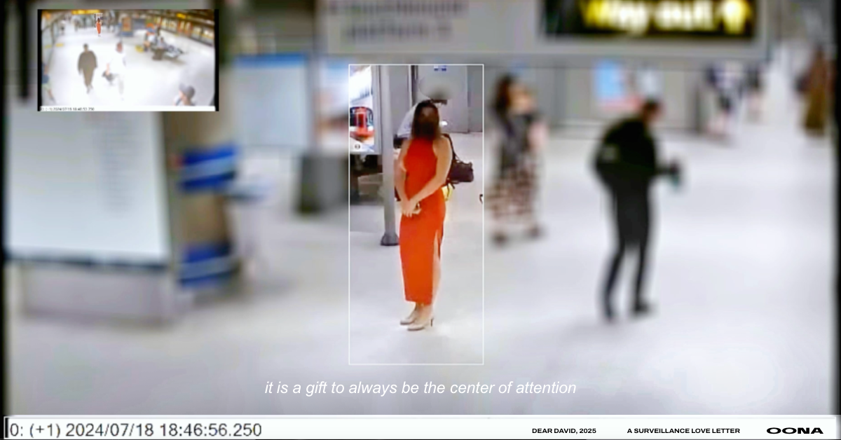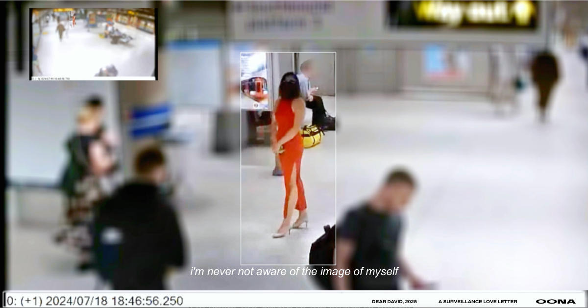 by Anika Meier “Where Does My Agency Over My Image Begin and End?” In a world increasingly shaped by surveillance and digital visibility, artist OONA challenges the boundaries of anonymity, identity, and consent. Using CCTV footage captured on the London Underground, she transforms state surveillance into a deeply personal exploration of self and agency. Her exchange with David, the Transport for London employee who processes public CCTV requests, adds an unexpected human dimension to this seemingly impersonal system and forms the basis of her video series Dear David. by Anika Meier In conversation with Anika Meier, OONA discusses her artistic practice, the impact of surveillance on body image, the blurred lines between self-surveillance and empowerment, and the evolving relationship between technology and privacy. OONA, Dear David Even Though I Wear A Veil , Still Image 2025 ANIKA MEIER: OONA, for many women, the male gaze feels omnipresent. You are an anonymous artist; you wear a mask and sunglasses. Was there a moment when your research and artistic practice extended into the topic of surveillance? OONA: I’m interested in how we see each other. That’s why my appearance and anonymity play such a big role in my practice today. Back when I first started working with surveillance, I was researching lens-based media and how lenses contribute to othering. I was especially interested in how women and unhoused people are othered through the use of cameras, particularly CCTV. I came to understand that surveillance had become more an extension of exclusion than a tool of protection. For example, where there once was a security guard physically patrolling an area to prevent unhoused people from loitering, you now have one person remotely monitoring eight locations at once. Exclusion is automated. I also came across studies showing that in CCTV control rooms, where cameras are manually operated, women were often tracked and watched. Surveillance acts like a literal extension of the male gaze. I first requested access to my own surveillance footage from King’s Cross in London, where I was studying at Central Saint Martins. It’s a semi-public, semi-private space. They had signs saying you’re under private surveillance and offering an address you could contact to request your footage. So I did. That began a much larger research process for me, realizing that in some cases you can request your footage, and in others you can’t. AM: What went through your mind when you realized you could request that footage? OONA: A lot went through my mind when I realized that my every move is tracked and recorded by some private company that I didn’t agree to. In the case of King’s Cross, I was especially disturbed to learn that facial recognition software had been used by a private company without anyone’s consent or even awareness. Just walking through the area was treated as consent. That felt like a massive violation of privacy, bodily autonomy, and image rights. Eventually, after public outcry, they were forced to shut down the facial recognition system. Around the same time, I was also making many audio recordings on the Tube as a countermeasure to lens-based surveillance. There’s a fundamental tension in how surveillance works—especially on public transport—because it doesn’t really protect me. It can’t; it only operates in the past. The things I worry about most, like sexual harassment, assault, being followed, or being touched inappropriately, aren’t prevented by surveillance. CCTV cameras don’t stop someone from leering or yelling. They don’t protect me in the moment. They only exist to confirm that something happened after the fact, not to stop it from happening. That has always bothered me. It ties into broader questions about how society treats women. The second issue I have with surveillance is that it often does not register the things that actually happen to me. Verbal harassment, for example, is not captured or addressed. Not that I want to be listened to all the time, but the reality is that these systems are not designed to protect people like me. If someone takes a photo up my skirt or touches me inappropriately, the CCTV footage is usually so poor that it would not even prove what happened. So who is it really for? It is not for me. It is for property. It is about maintaining a general sense of order, but one that does not actually protect me or the most vulnerable people in public space. OONA, Dear David It Is A Gift, Still Image , 2025 OONA, Dear David I Never Miss You, Still Image 2025 OONA, Dear David I'm Never Not Aware, Still Image 2025 AM: And what about the London Underground? OONA: When I take the Tube in London, my body effectively becomes part of a system: tracked as data and reduced to information. In that moment, it feels like I’ve become state property in some way. That raises a deeper question: where do I, as a person, reclaim ownership over myself… my image, my presence, my data? My interest in surveillance is, of course, connected to the government because they surveil and because I see the government as one of the key structures through which systems of power operate. But what really interests me is the question of consent. It is less about a critique of the government and more about asking: what have I agreed to? What have I unknowingly given up? Where does my agency over my own image begin and end? AM: Then you found out that you can request your footage from Transport for London, from the UK Government. How does the process actually work? OONA: It is a form online. You fill out your name, your address, a copy of your government-issued ID, where you were, what times you entered, and what platforms you used. I try to be really helpful and provide all the specifics, even a photograph of what I was wearing. Basically, you give them all this information in the form and explain why you want the footage. In my first form, I think I responde